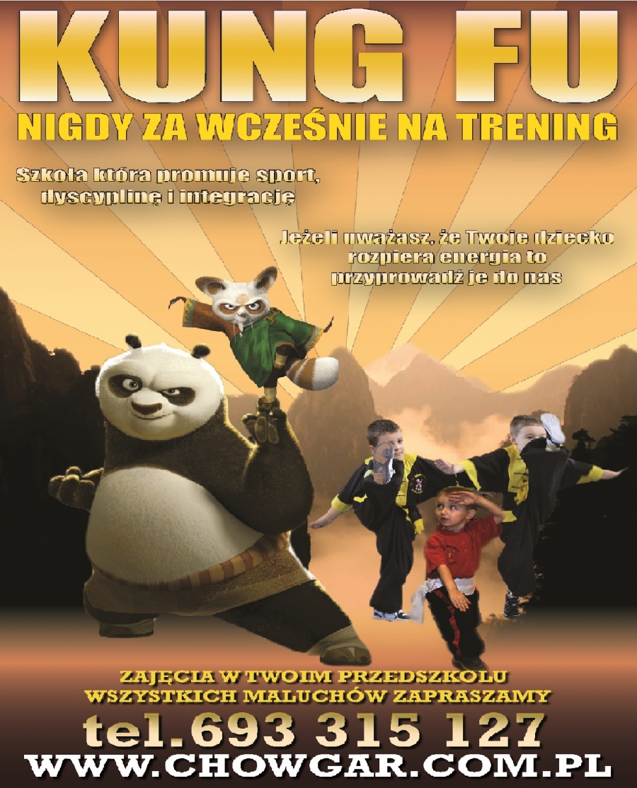 Zapraszamy najmłodszych (3-6 lat) na zajecia z Kung Fu w naszej szkole. Startujemy 29 Październik. Pierwsze zajecia bezpłatne. Trening będą odbywały się we Wtorki i Czwartki o godz. 16:30 do 17:00. Grupy bedą liczyć po 12 osób, zapisy trwają. Moża zgłaszać się telefonicznie lub mailowo, zapraszamy do zakładki kontakt.