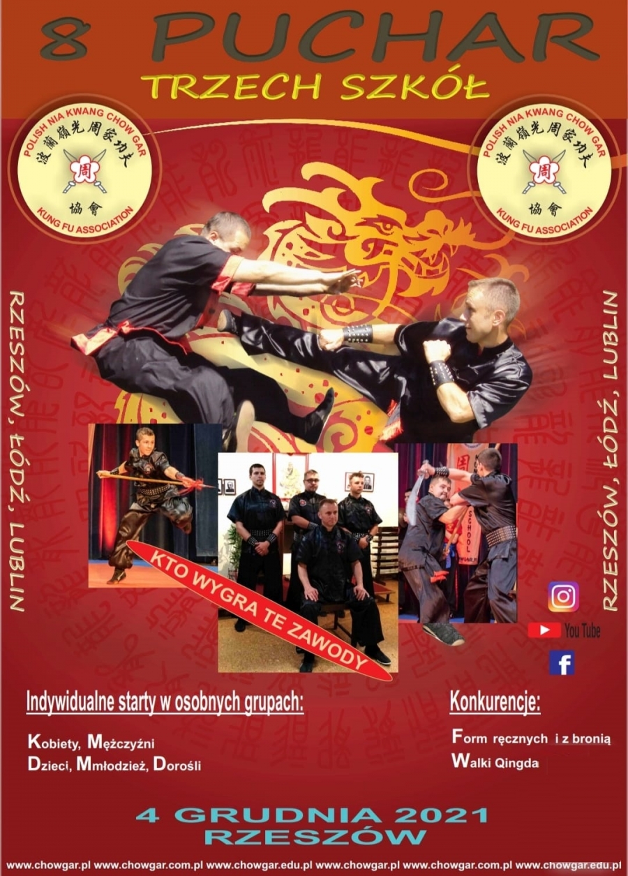 4 grudnia w Rzeszowie odbył się VIII Puchar Trzech Szkół, zorganizowany przez Polish Nia Kwang Chow Gar Kung Fu Association. Naszą szkołę reprezentowało 31 zawodników najmłodszy 7 lat, a najstarszy 40. Przywieźliśmy 16🥇 złotych medali 9🥈 srebrnych i 8 🥉brązowych. Starty odbywały się w konkurencji form i walk. Dla wszystkich wielkie GRATULACJE ☺️👍